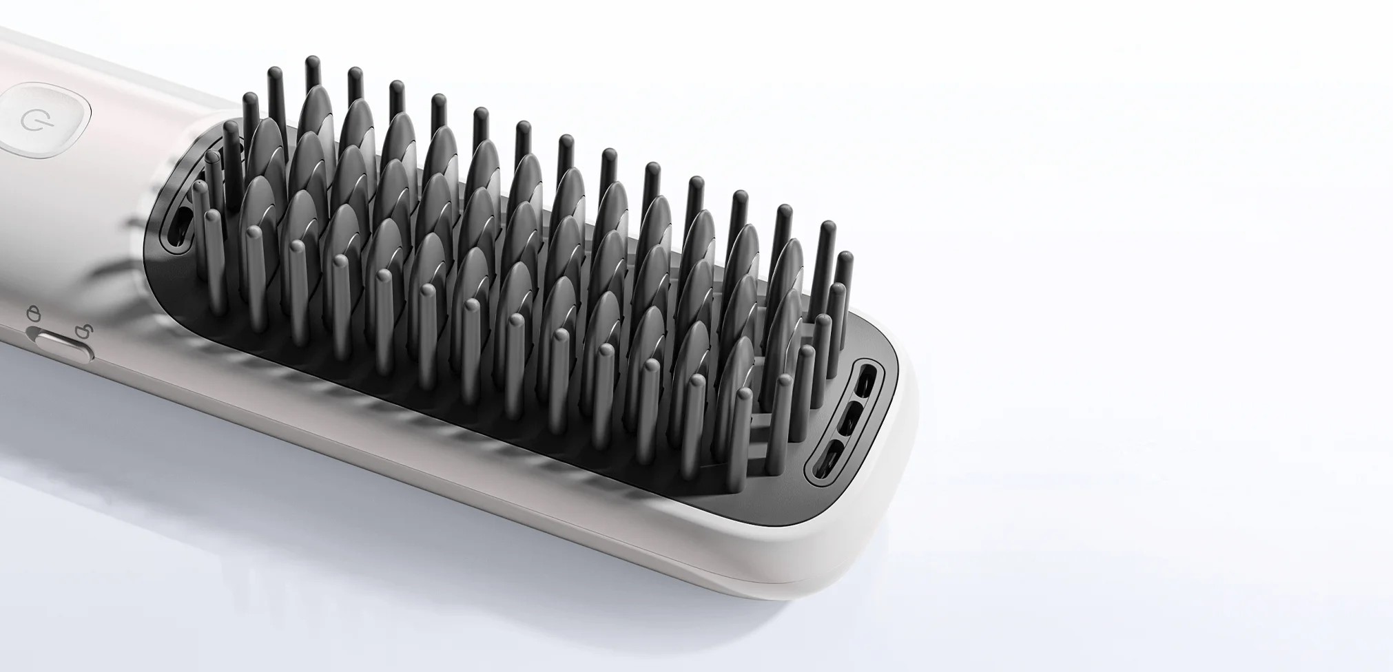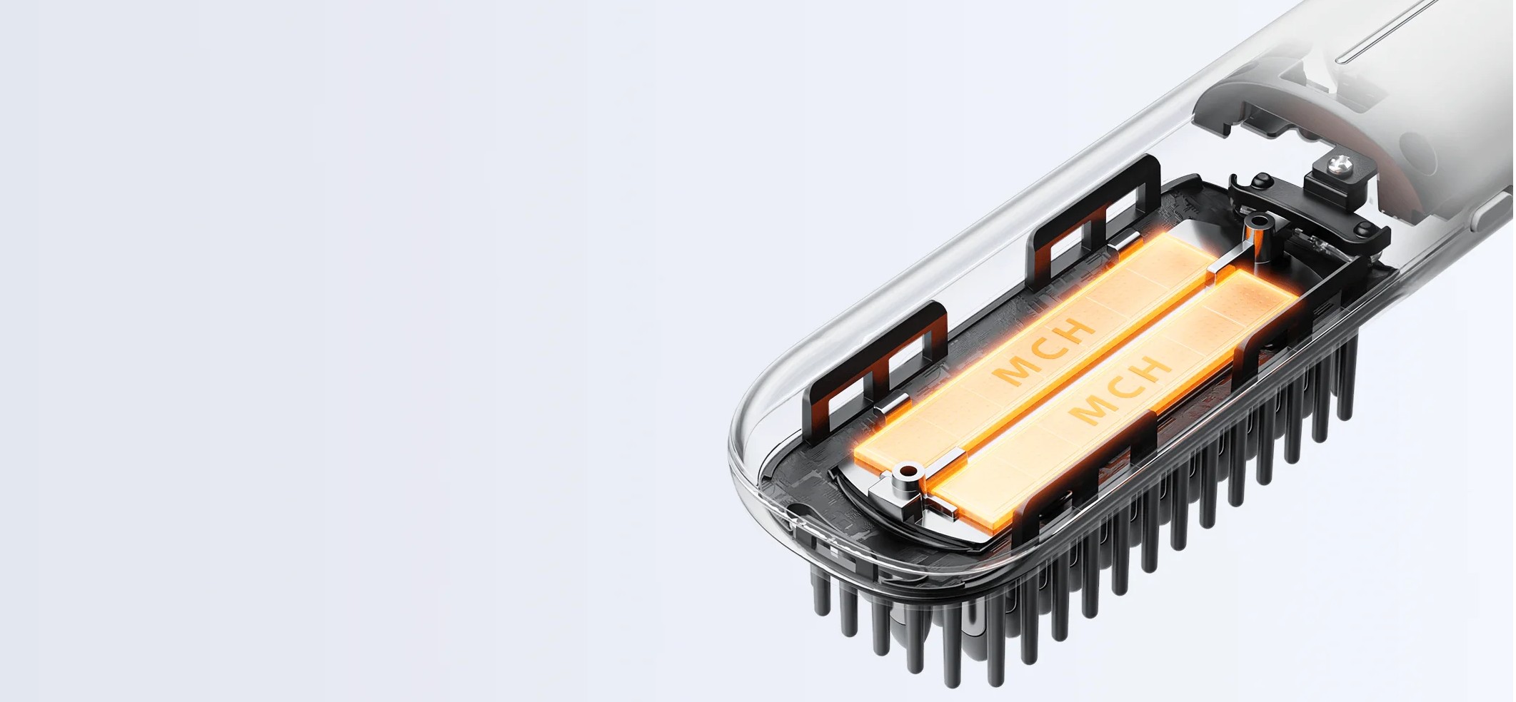 Щётка оснащена нагревательными элементами с керамическим покрытием, которые равномерно распределяют тепло, не повреждая структуру волос. Температура регулируется в диапазоне от 160°C до 200°C, что позволяет подобрать оптимальный режим для тонких, окрашенных или густых прядей.